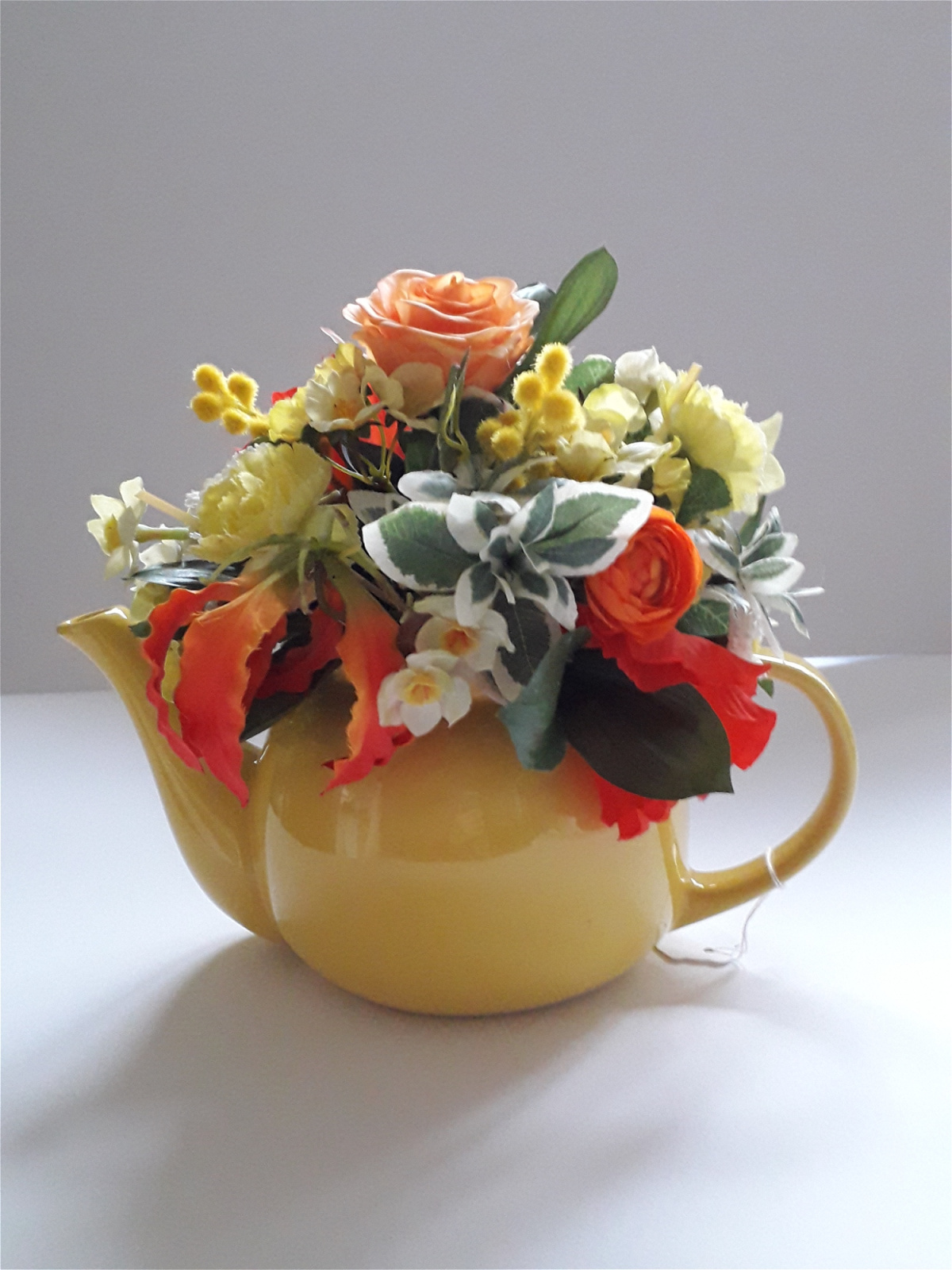 Yellow Teapot Arrangement. All artificial flowers and foliage, including: