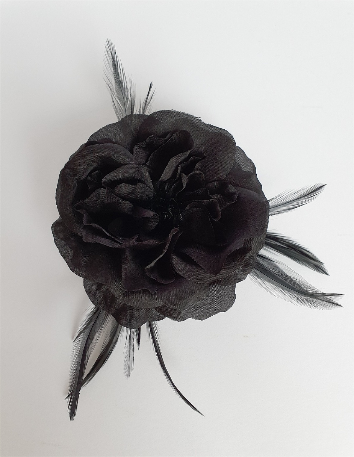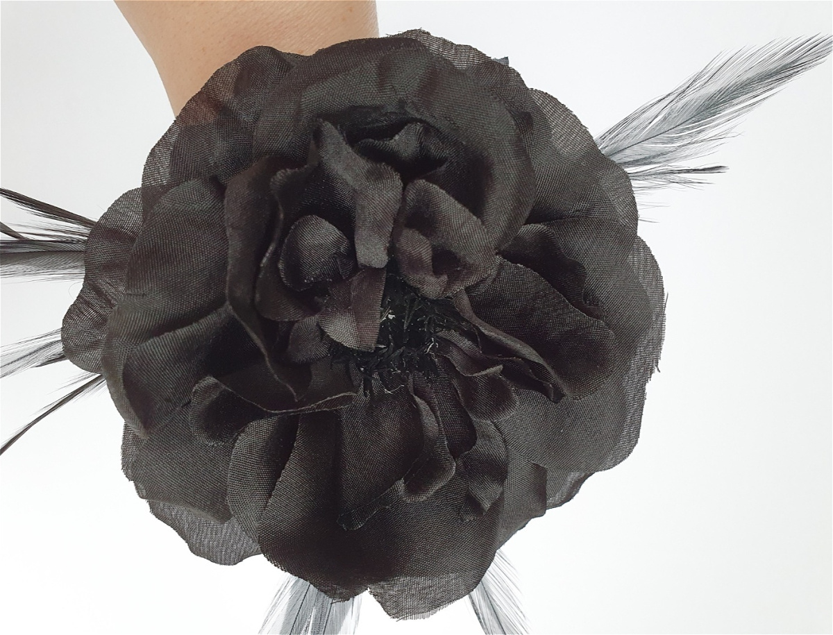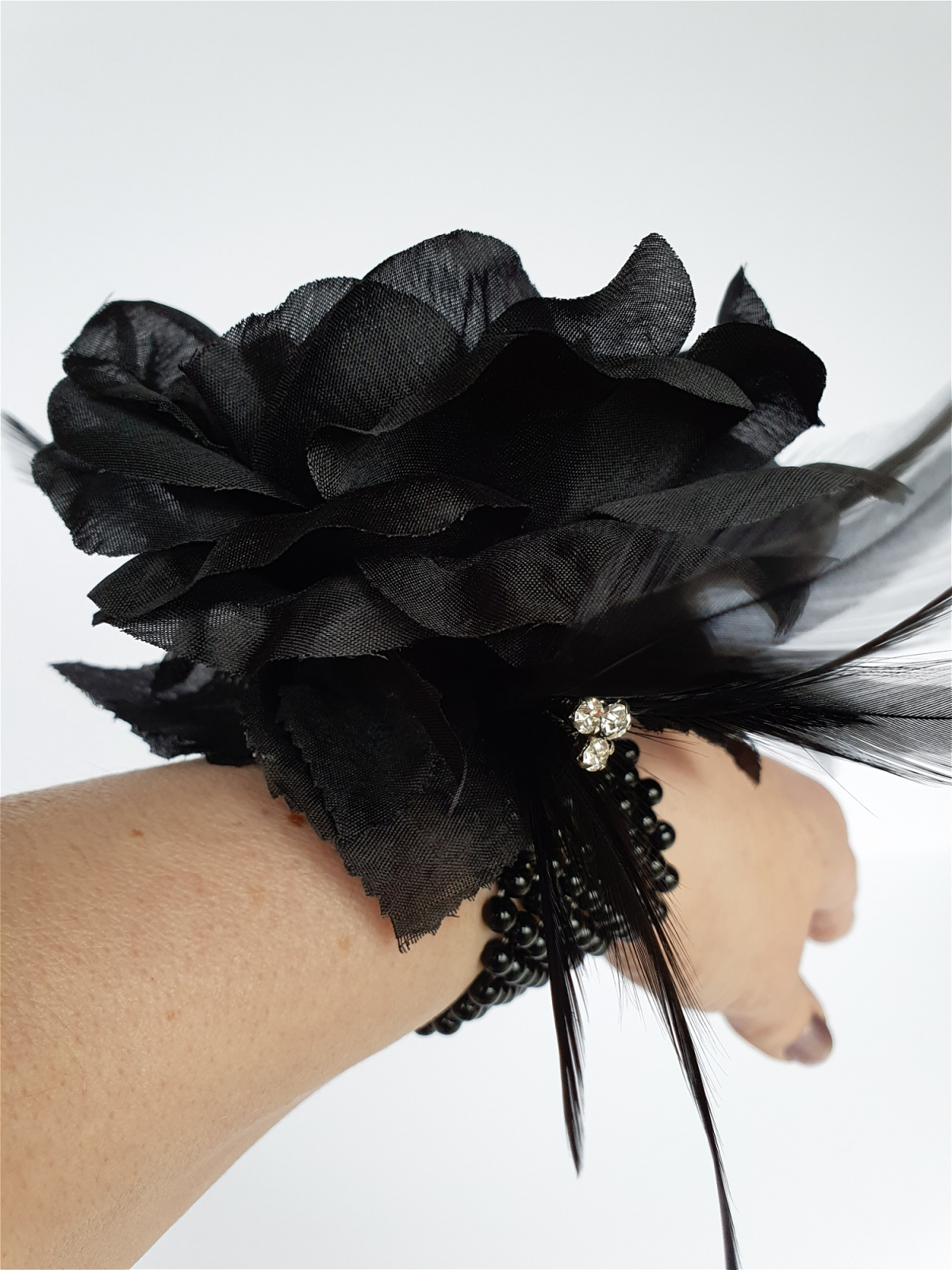 Black Rose Wrist Corsage. Artificial black Rose on a black wrist bracelet, with black feathers and faux diamantes.