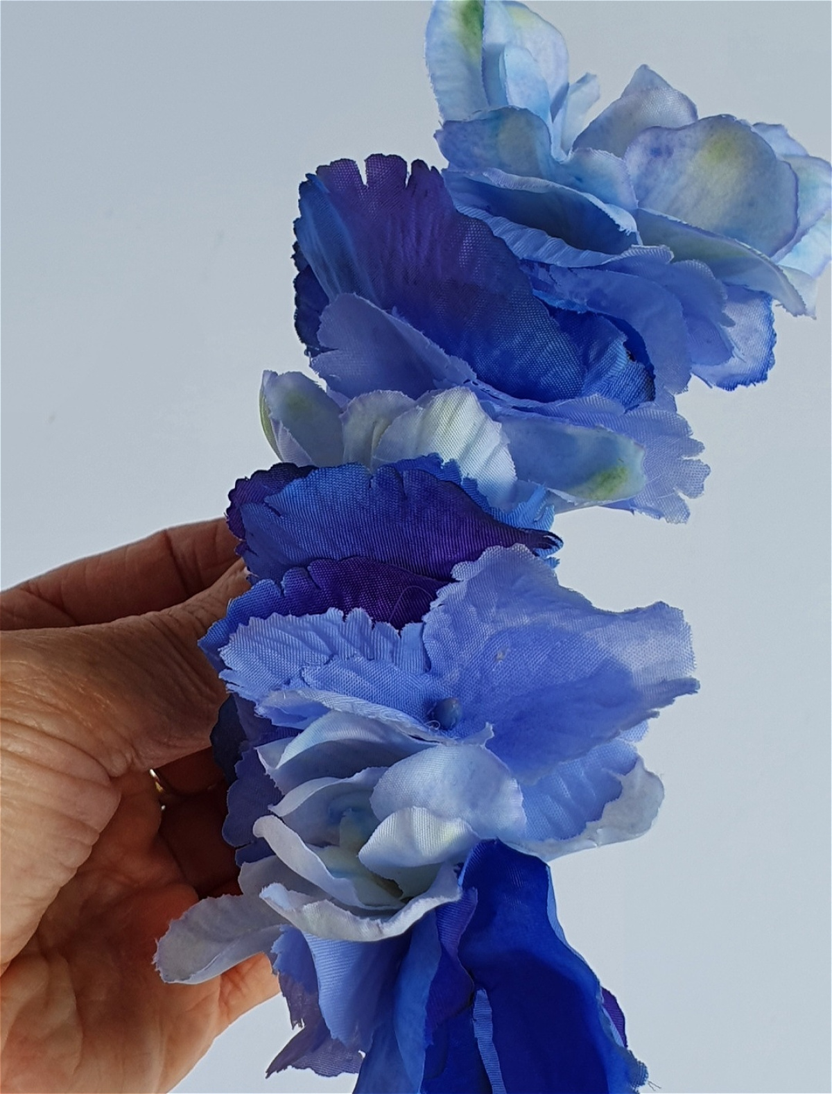 Beautiful dark and light blue, artificial Hydrangea and light blue Delphinium flowers decorate a hair comb.