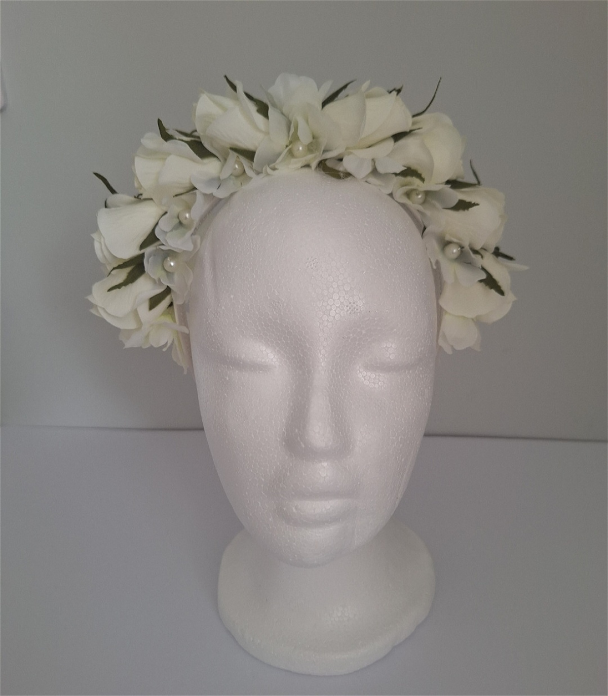 Bridal Rose Headband. Artificial Ivory Roses down each side of a white headband, with White Blossom flowers at each side, and faux pearl beads at the front.