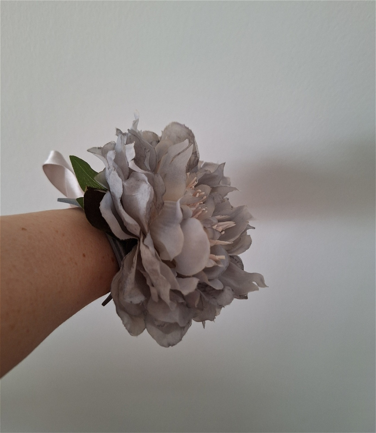 Grey Wrist Corsage. Lovely artificial pale grey open Peony with a little bit of peach colour in the centre of the Peony, with green leaves underneath. Grey ribbon threaded through the base to tie onto your wrist/arm.
