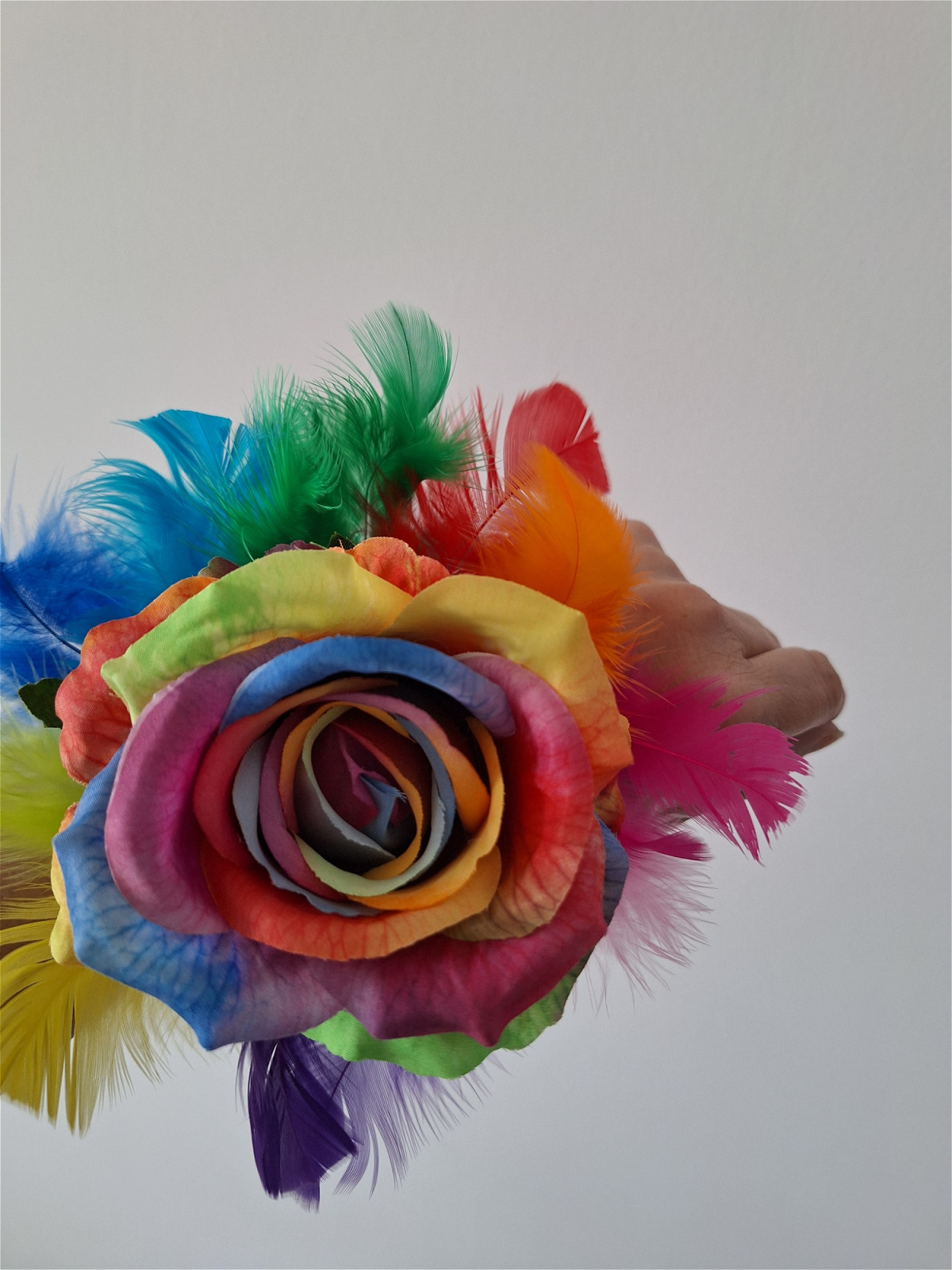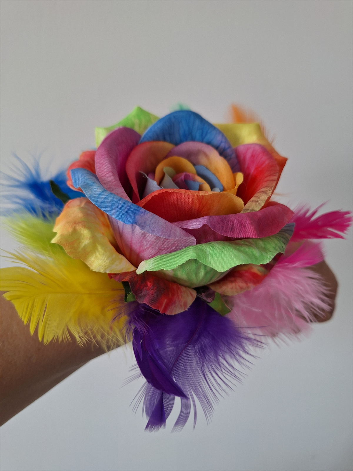 Rainbow Wrist Corsage. Lovely artificial rainbow coloured Rose with rainbow coloured feathers on a black beaded bracelet.
