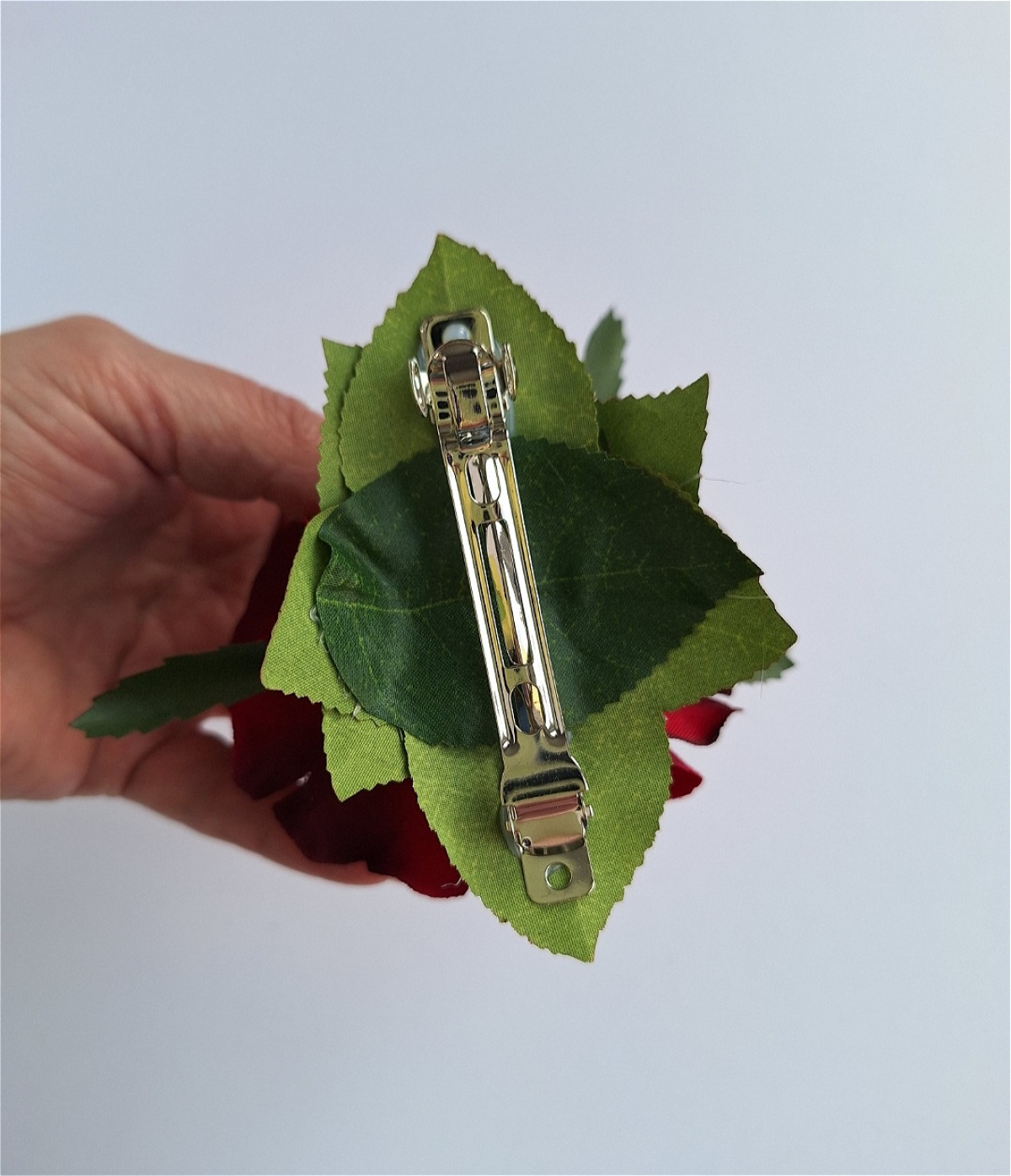 Because each Red Rose Hair Clip is put together by hand, appearance may vary slightly between each one, due to placement and availability of materials, but will be as close to the picture as possible.