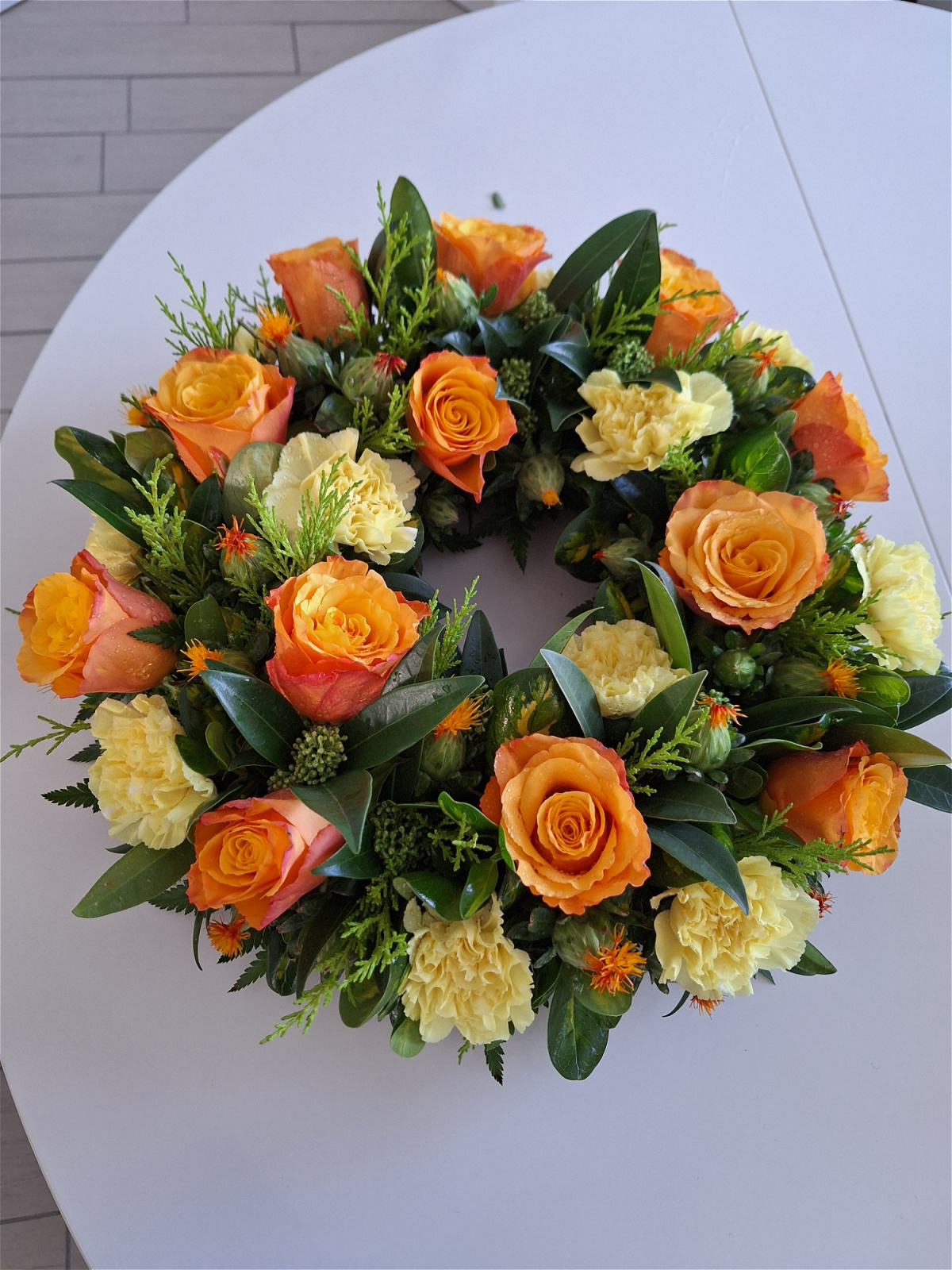 Beautiful Orange Roses, Lemon Carnations, Carthamus and a selection of foliage.